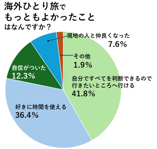 よかったことは?」という質問をしたところ、41.8%の方が挙げたのが「自分ですべてを判断できるので行きたいところへ行ける」という回答。海外でも自分の行きたいところに積極的に出かけるアクティブさが垣間見られました。次いで「好きに時間を使える」という回答が36.4%、「自信がついた」という回答が12.3%で続きました。(n=316)