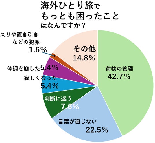 海外ひとり旅経験者に、「海外ひとり旅でもっとも困ったことは?」という質問をしたところ、42.7%の人が「荷物を置いておけない」と回答。日本の感覚でテーブルやイスに荷物を置いておく