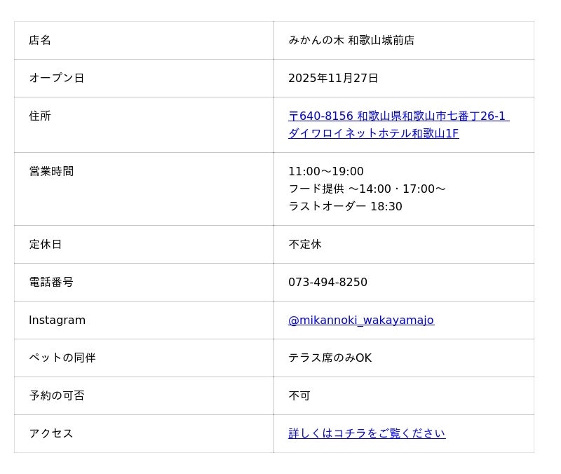 このたび、その想いをさらに広げる形で、和歌山市の中心部である和歌山城前に2号店となる「みかんの木 和歌山城前店」を11月27日に新しくオープン。有田みかんの“素材の味”を、街なかでも気軽に楽しんでいただけるカフェ&ショップです。