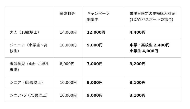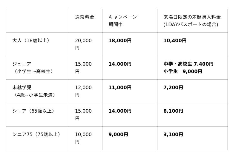 ※差額購入:1DAYパスポート、アフター3パスポート、1.5DAYパスポート、2DAYパスポートを購入いただいた場合、入場後お帰りの際に年間パスポート料金との差額で年間パスポートにアップグレードいただけます。