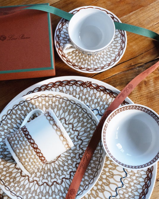 洗練されたインテリア愛好家の方には、〈プンティ・ア・マリア〉をご提案します。このテーブルウェアコレクションの最新作は、フランスの磁器の伝統と、ロロ・ピアーナのテキスタイルのノウハウがエレガントに融合しています。18世紀半ばに遡る磁器製造の伝統を持つリモージュで、熟練した職人たちの手により、メゾン独自の編み方を再現した複雑な模様で装飾されたプレートをひとつひとつ丁寧に仕上げられており、ロロ・ピアーナならではの真正性を体現しています。