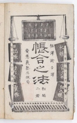 『帳合之法(ちょうあいのほう)』福澤諭吉は1873年、ブライアント、ストラットン共著の商業簿記の教科書(Embracing single and double entry. New York,1871)の翻訳本として『帳合之法』出版。本書は日本初の簿記学(西洋式複式簿記)のテキストで、これを用いた「新しい記帳法」の有料講習会が、同年7月に丸屋商社の店内で開かれた。