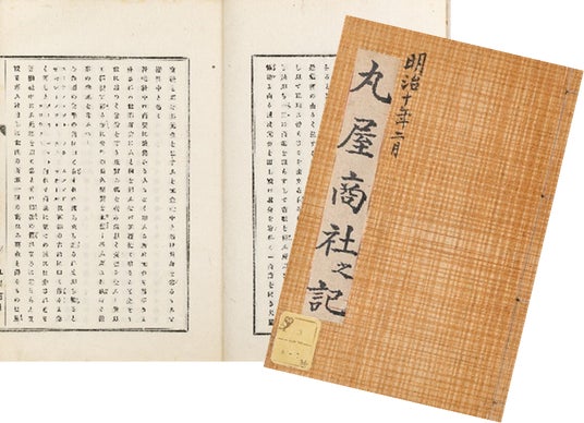 『丸屋商社之記』 (日本初の会社設立趣意書・明治6年復刻版)商社組織を株主「元金社中」と社員「働社中」に分けた点が、株式会社組織の初めとして評価が高い。誰が起草したかは、「福澤説」、「有的説」、「有的が起草し福澤添削説」等と乱立しており確定していない。