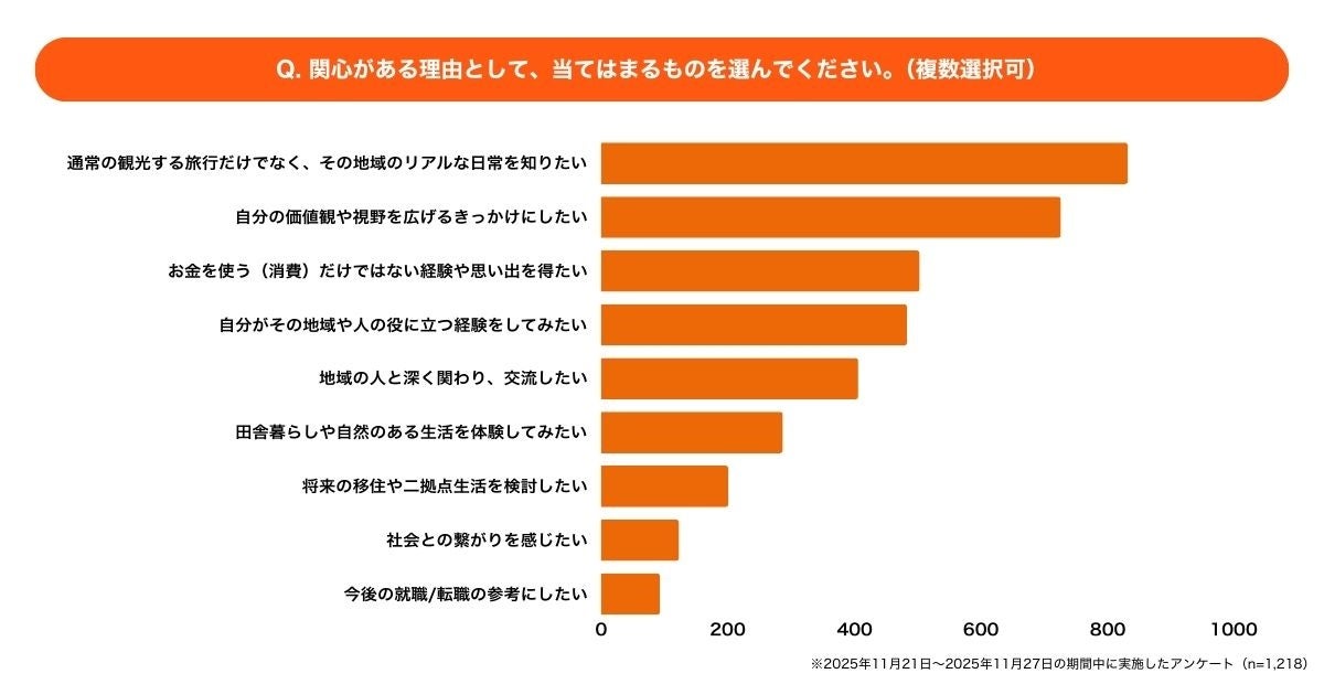 「関心がある理由として、当てはまるものを選んでください(複数回答可)」という問いに対し、トップは「通常の観光する旅行だけでなく、その地域のリアルな日常を知りたい(70.5%)」でした。次いで「自分の価値観や視野を広げるきっかけにしたい(61.5%)」が続き、多くの人が受動的な“消費する旅”ではなく、能動的に“地域と関わる旅”を求めていることが分かります。