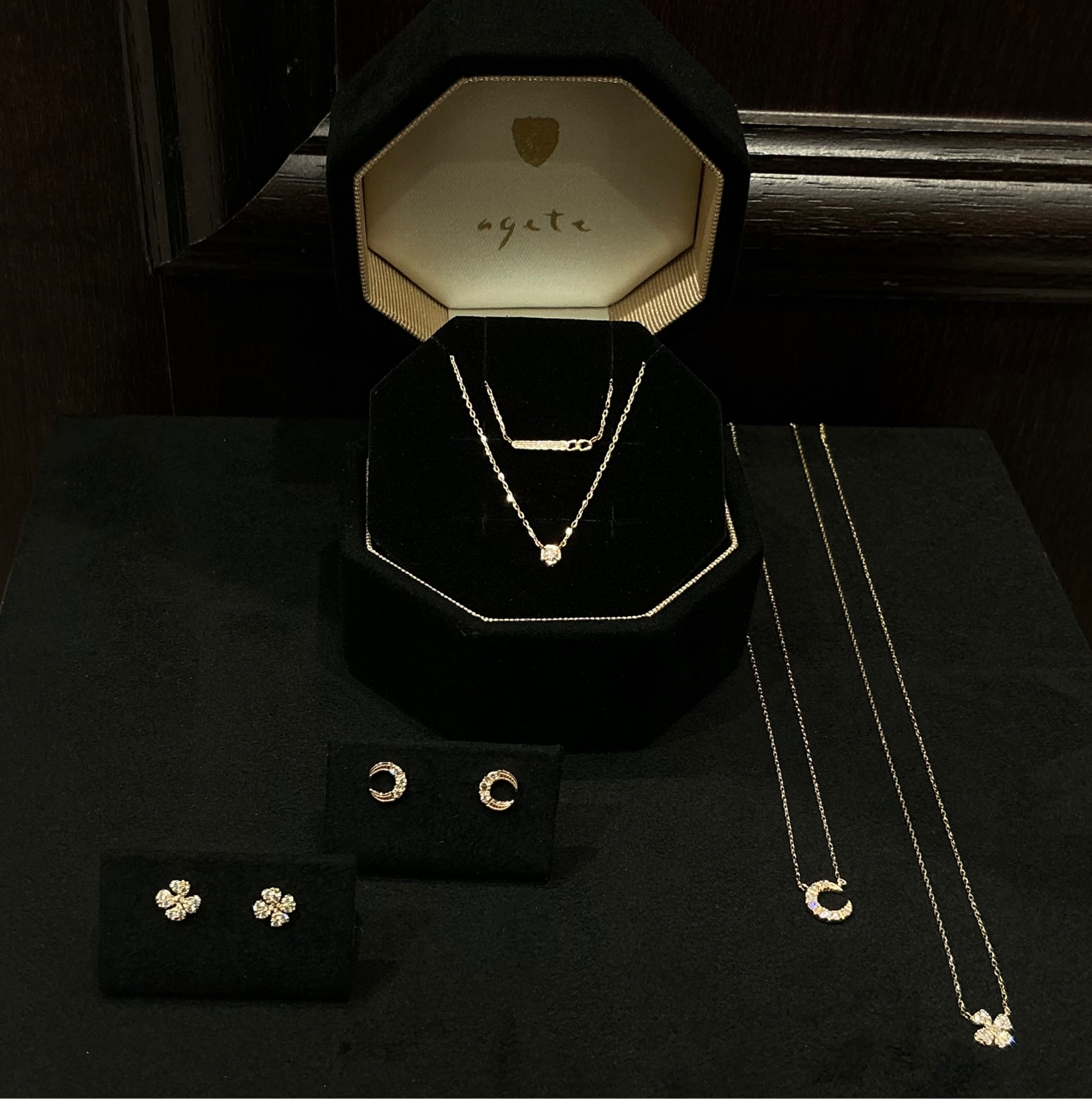 1粒とバータイプのネックレスはシンプルに、四つ葉のクローバーと三日月のモチーフネックレスは華やか且つお守りとして身につけていただけます。