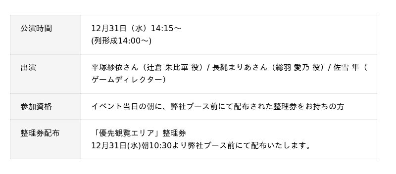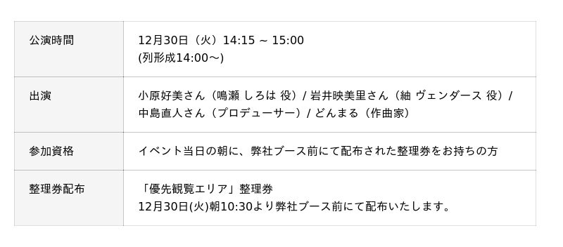 参加には、当日の朝に弊社ブース前にて配布の「優先観覧エリア」整理券が必要となりますので、ご注意くださいませ。