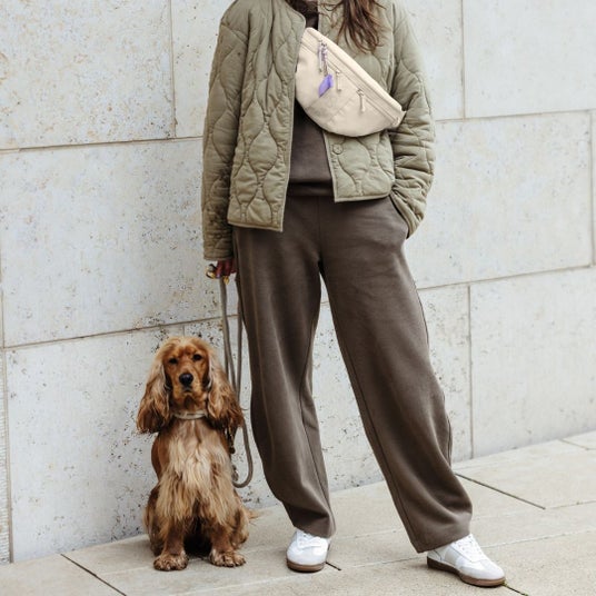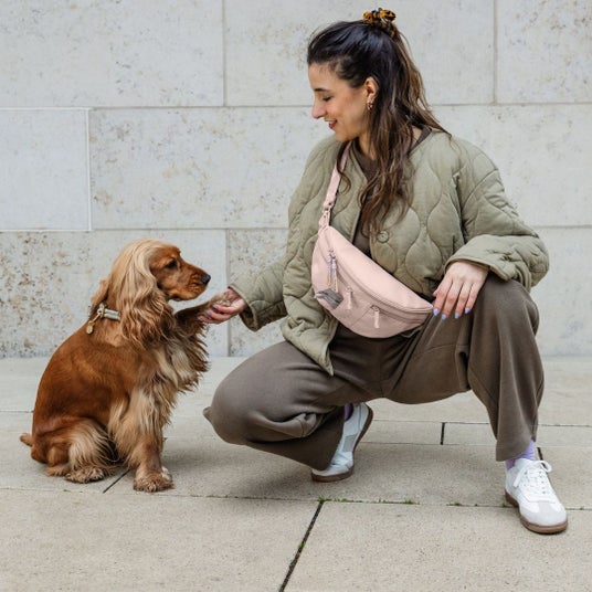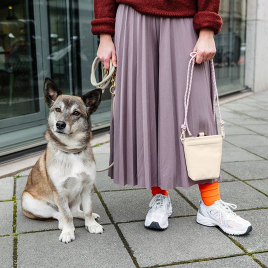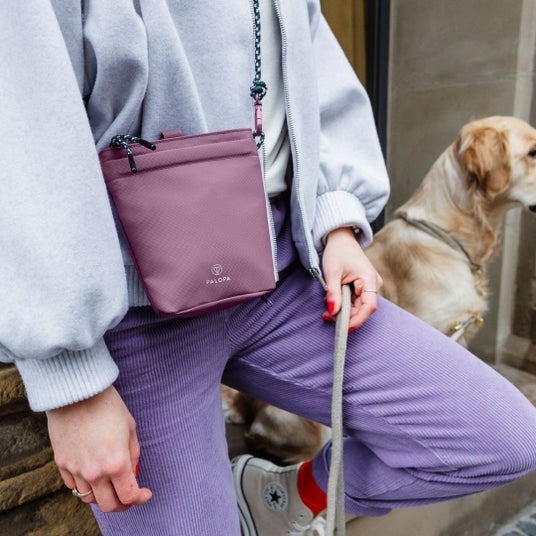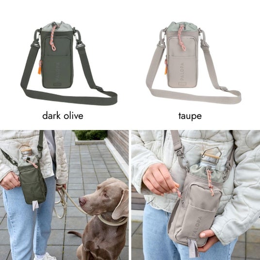 散歩やドッグスクールに最適な犬のお散歩ショルダーバッグ。携帯電話や鍵、おやつを収納できる十分なスペースがあり、シンプルな色合いで使いやすいデザインです。