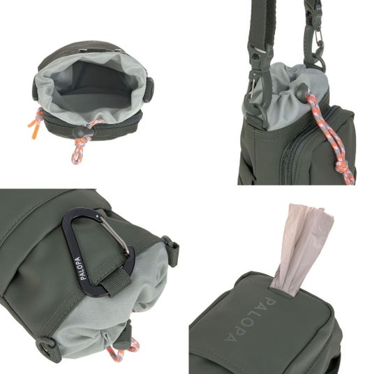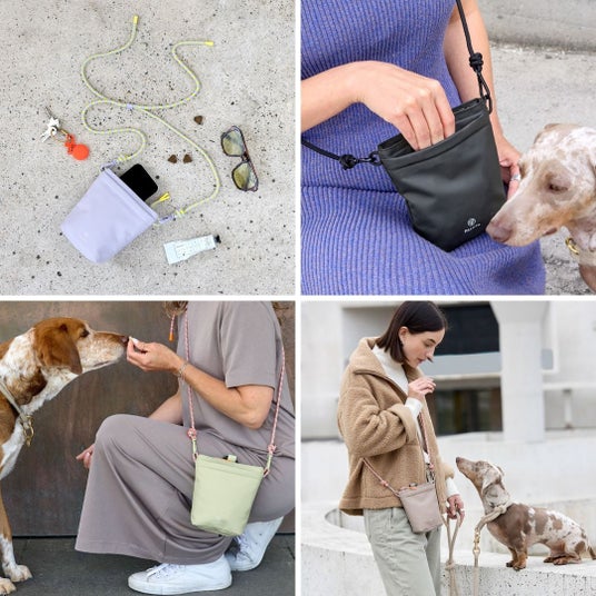 首から斜めがけできるショルダータイプに設計されており、マグネット式の開け口で素早くアクセスできます。撥水性のある素材で、汚れもさっと拭き取れるので、雨の日の愛犬のお散歩や外出先でも安心です。取り外し可能なショルダーストラップで3通りの持ち運びが可能です。