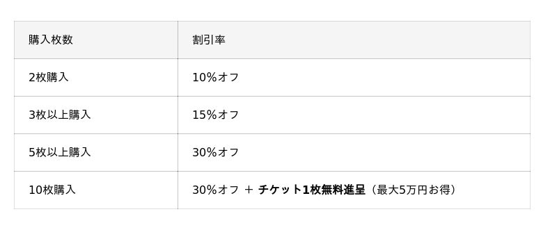 コンコイで利用できる参加チケットを、まとめて購入すると割引が適用される特別キャンペーンです。購入枚数に応じて10%~30%オフ、さらに10枚の購入でチケット1枚を無料進呈。