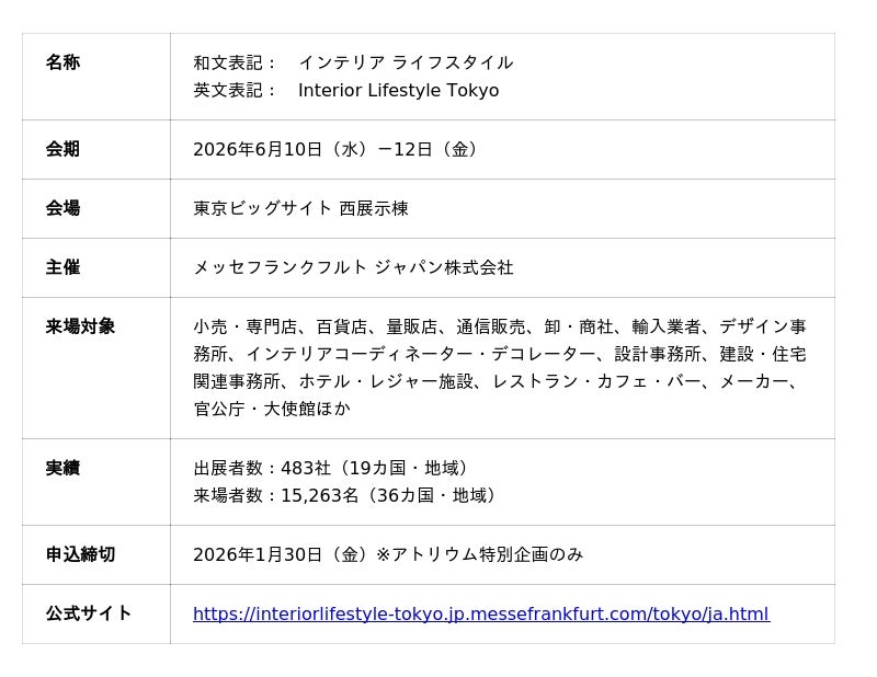 インテリア・デザインのための国際見本市「インテリア ライフスタイル」(主催:メッセフランクフルト ジャパン株式会社、代表取締役社長:梶原靖志)は、アトリウム特別企画の出展者募集を開始しました。2026年テーマは「ワーク&ライフスタイル 仕事と生活の公私同根(こうしどうこん)」。ものづくりはビジネスのためだけの行為ではなく、個人的な興味や日常の気づきが持つ面白さ・ときめきを価値の源泉として捉え直しました。公(仕事)と私(生活)の根が地続きであるという視点をコンセプトに、単にモノを提供する場ではなく、出展者が抱くストーリーや熱量に共感するバイヤーと出会える場を目指します。