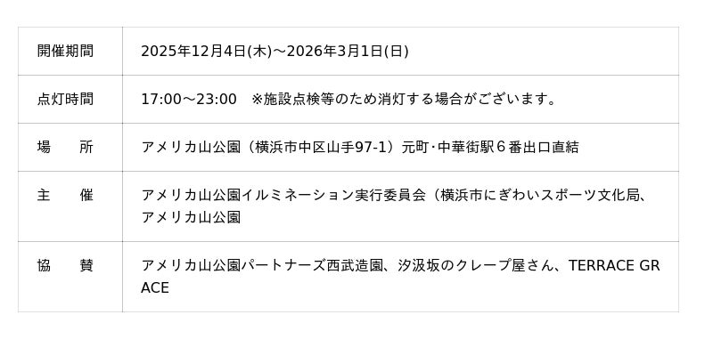 横浜高速鉄道株式会社(横浜市中区、代表取締役社長 森 秀毅)では、沿線のイルミネーションと連携し、みなとみらい線元町・中華街駅直結のアメリカ山公園にて、ウインターイルミネーション『アメリカ山公園 ROOFTOP ILLUMINATION ~ハチが光(ミツ)をもたらす~』を2025年12月4日(木)から2026年3月1日(日)まで開催します。