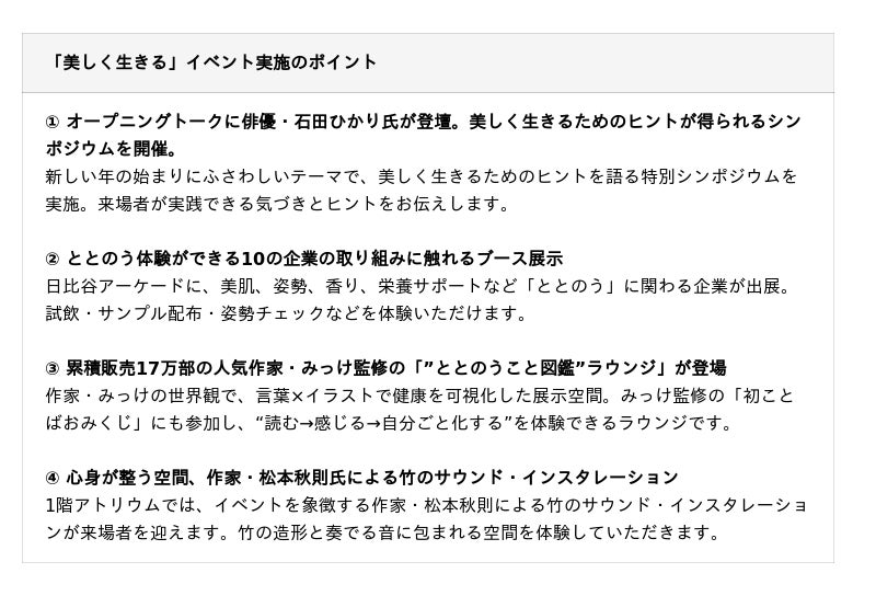 三井不動産株式会社(東京都中央区、代表取締役社長:植田俊、以下「三井不動産」)は東京ミッドタウン日比谷(千代田区有楽町)で、2026年1月9日(金)~18日(日)の10日間、10社の共同参画企業とウェルネスイベント「美しく生きる」を開催いたします。