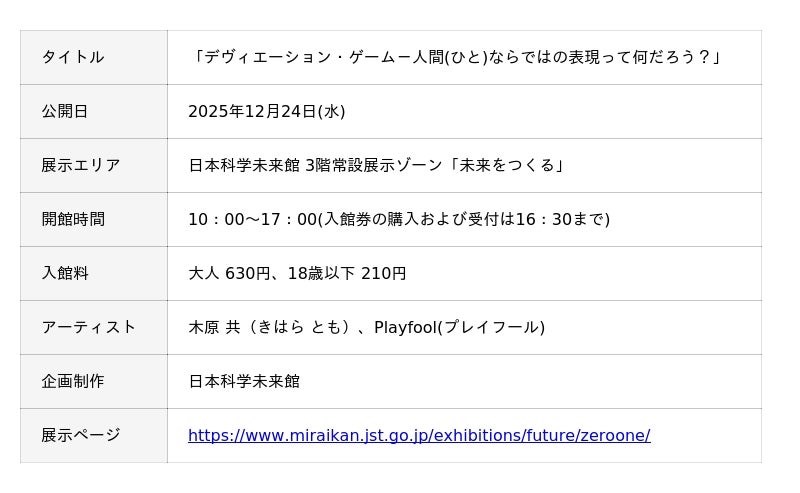 日本科学未来館(略称:未来館 館長:浅川智恵子)は、アート作品を通じて科学技術について考える常設展示「零壱庵(ぜろいちあん)(※)」において、「デヴィエーション・ゲーム-人間(ひと)ならではの表現って何だろう?」を、2025年12月24日(水)から公開します。AIと人間のお絵描きゲームを通じて、AIにはない「人間ならでは」の創造性について探究します。