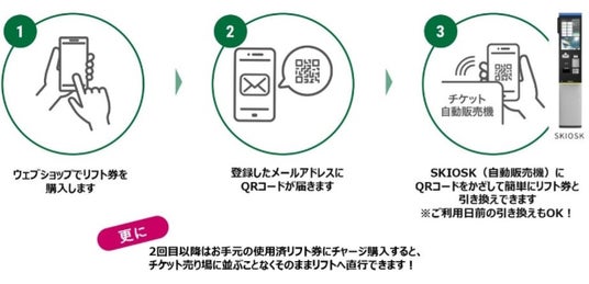八方尾根スキー場のWEBSHOPでは、滑走当日はスマホに届いたQRコードを自動販売機にかざすだけでスムーズに発券できます。また、次回以降のチケット購入の際は、お手持ちのICカードにチャージするとリフト券をお得に購入することができ、そのままリフトにアクセス可能に!お客様の利便性を追求しサステナブルに、さらに混雑回避も実現しています。