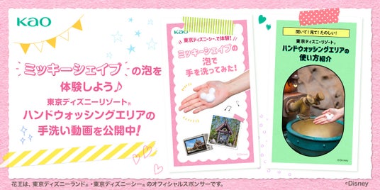 今回公開した動画は、花王がオフィシャルスポンサーとして提供している東京ディズニーリゾート(R)のハンドウォッシングエリアの魅力を紹介するとともに、ミッキーシェイプの泡をきれいにつくるコツなど、正しい使い方をわかりやすく解説する内容となっています。ハンドウォッシングエリアを「まだ体験されたことのない方」や、「使い方をご存じなかった方」「より上手に泡を作りたい方」まで、幅広くお楽しみいただける内容となっています。