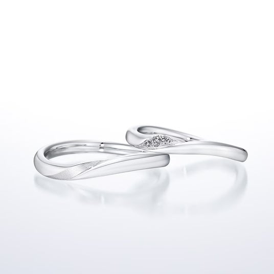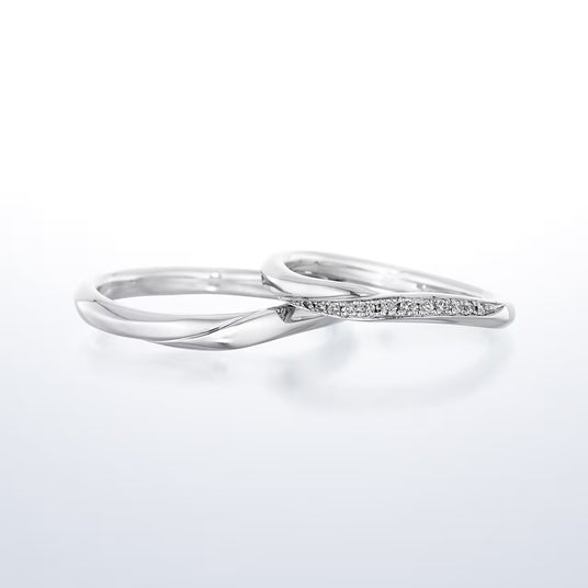 なめらかな中央のくびれから生まれるプラチナの美しい陰影とメレダイヤモンドの煌めきが一体となることで、永遠を意味するインフィニティをさりげなく表現しています。エタニティリングのように繊細に連なるメレダイヤモンド(右)と、ゆるやかにカーブするダイヤモンドポイント加工のアクセントが効いたリング(左)の対比が美しく、ペア感を楽しめるマリッジリングです。