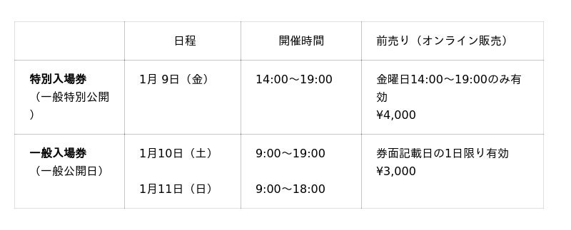 1月 9日(金) 9:00~19:00(ビジネスデイ[業界&報道関係者公開日])※9:00~14:00はサイレントタイム(一般公開なし)