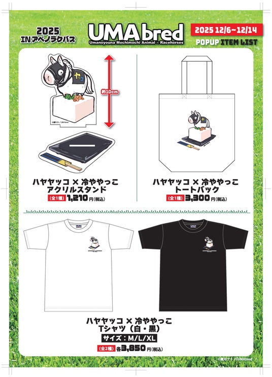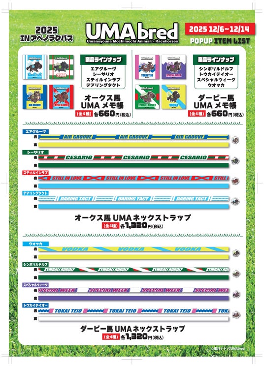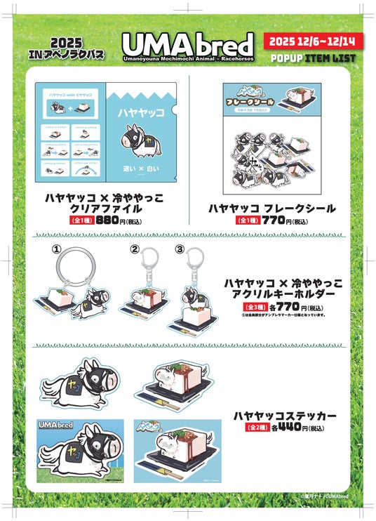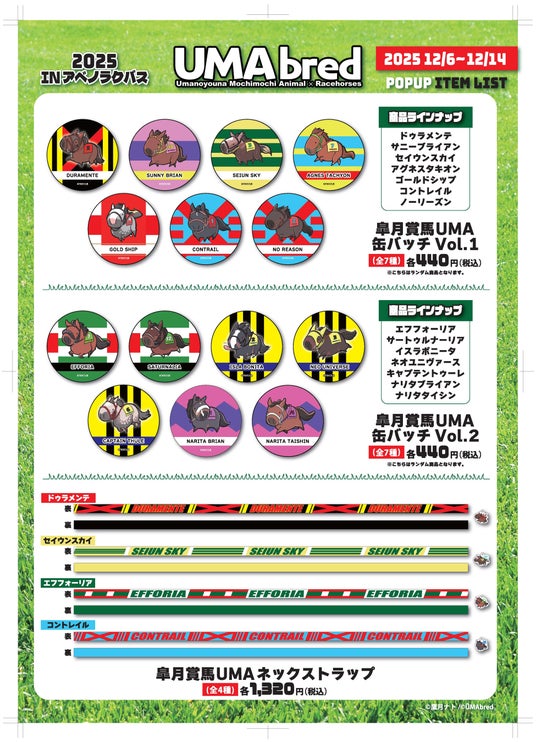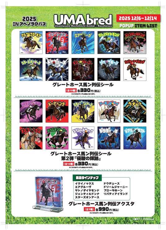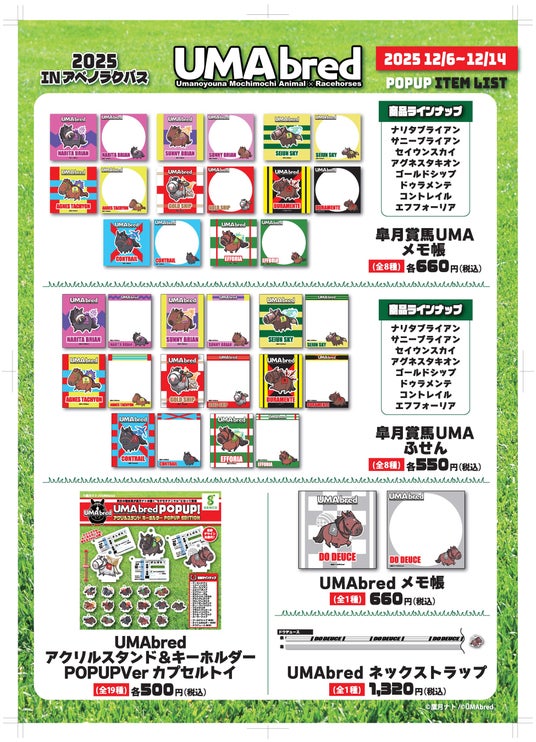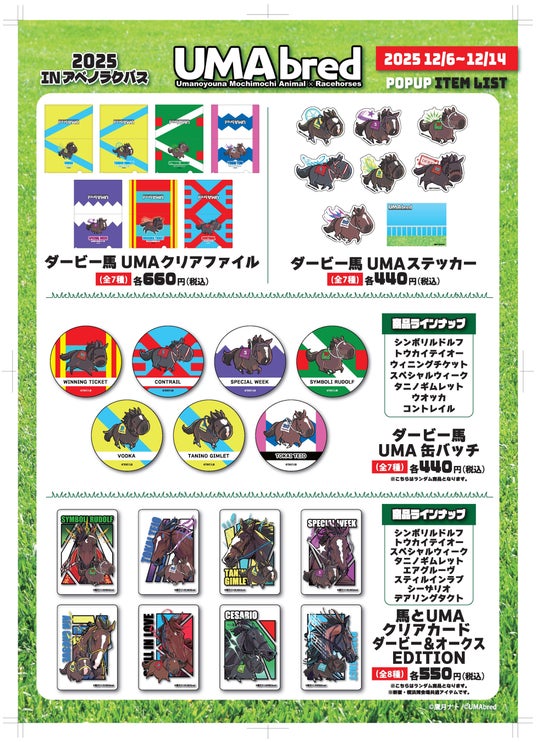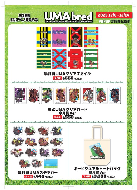 実在の競走馬・引退馬を「UMA」(ウマのようなモチモチアニマル)として描きおろすグッズブランド「UMAbred」は12/6より「UMAbred 大集結 ~アベノラクバス 秋の陣~」と題し、従来のPOPUPよりも小規模なPOPUPを「サテライトPOPUP」として開催いたします。