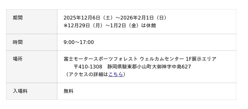 富士モータースポーツフォレスト株式会社(本社:静岡県小山町)は、同社施設「ウェルカムセンター」において、「ジャパンモビリティショー」でトヨタグループが出展し話題を集めた主要車両の特別展示を行います。展示期間は2025年12月6日(土)から、2026年2月1日(日)までです。