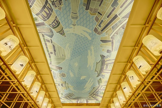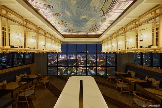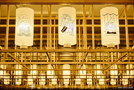 浅草の街に提灯が灯る頃、パブリックスペース「OMOベース」の空間デザイン及び施工も実施。手書きで制作した提灯には、浅草の歳時記にちなんだイラストが浮世絵のように描かれ、一年を通して街の行事が多い浅草の賑やかな様子を楽しめます。天井には、浅草の街並みを描いた天井絵も描かれており、よく見ると和柄が細かく描かれている遊び心も。
