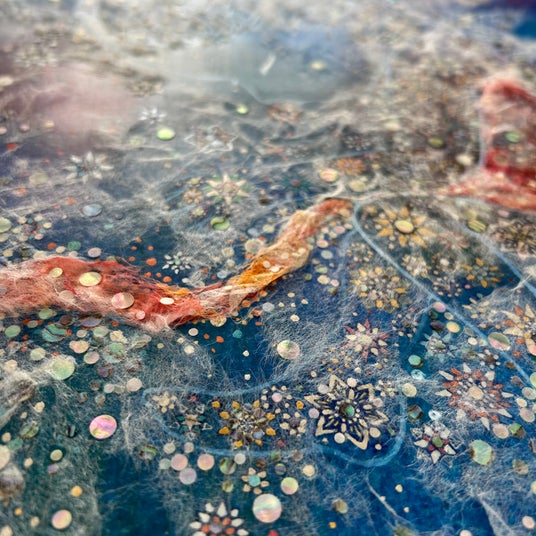 『廻る』 (円形 2点)『廻る』は、命が宇宙の粒子から生まれ、やがて再び宇宙へ戻っていく生命の循環をテーマにした作品です。亡くなった大切な存在が小さな光の粒となって寄り添っているような、静かで温かい感覚が込められています。色鉛筆の奥行きある色彩に手漉き和紙の質感が重なり、螺鈿が紡ぐ光がまるで星々のきらめきのように響き合うことで、作品全体に深い余韻が生まれています。自然光が差し込むホテルの空間と調和し、訪れるたびに異なる表情を見せるインスタレーションとなっています。