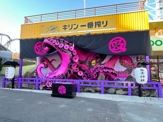 「富士急ハイランドに現れた巨大タコ」というユニークな設定のもと設置されたこのモニュメントは、高さ約3.5m、幅約6mを誇ります。フードスタジアム外壁の一部を包み込むように巨大なタコがどっしりと構え、その一角が多幸神社として彩られています。