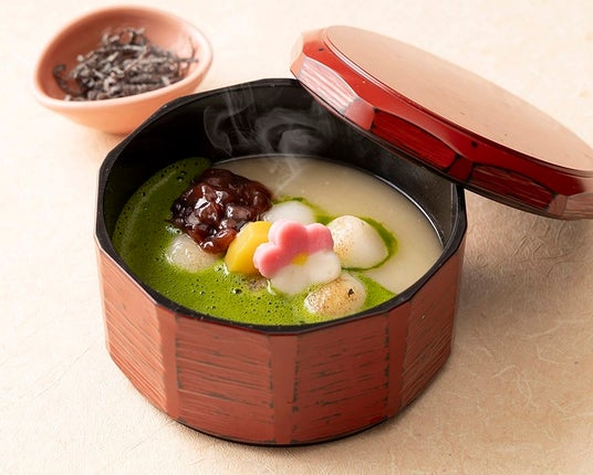 「抹茶餡の炙り白玉しるこ」香ばしく焼き目をつけた炙り白玉を、上品な甘さの白あんと共に盛り付け、点てたての抹茶と合わせてご提供します。