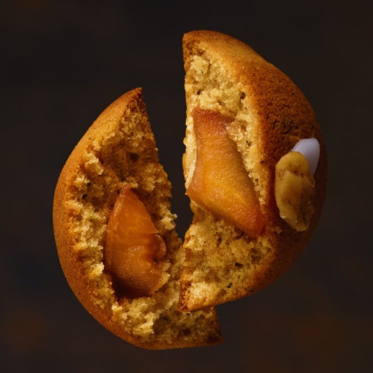 メープルシュガーやカラメルソース、紅茶の茶葉などを加えた生地に、甘く煮てシナモンで香り付けした一口大のりんごを入れ、じっくりと焼き上げました。ドーム型の生地のトップは、砕いたくるみとフォンダン(砂糖衣)で飾り付けています。メープルのやさしい甘さにりんごと紅茶の華やかな風味が重なり合う、冬限定のヴィジタンディーヌです。