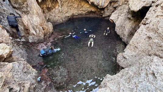 - 珊瑚岩の険しい地形を進み、海と繋がる静かな水面に浮かぶ体験