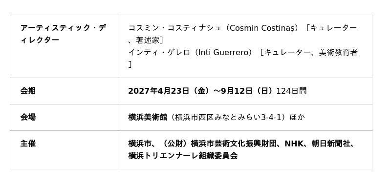 企画を統括するアーティスティック・ディレクター(以下、AD)には国際的に活躍するキュレーターの二人組、コスミン・コスティナシュ(Cosmin Costinaş)とインティ・ゲレロ(Inti Guerrero)を迎え、横浜美術館を中心に横浜ならではの現代アートの展覧会をお届けします。会期は2027年4月23日(金)から9月12日(日)までの124日間です。