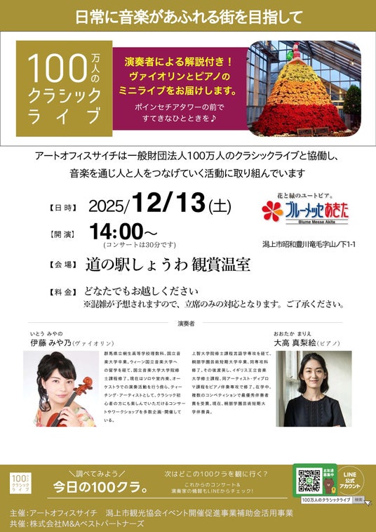 製造、建設、不動産、医療・ヘルスケア、物流、ITに特化したM&A仲介を行う株式会社M&Aベストパートナーズ(本社:東京都千代田区、代表取締役社長:齋藤 達雄 以下M&Aベストパートナーズ)と、一般財団法人100万人のクラシックライブ(東京都千代田区、代表理事:蓑田秀策 以下100万人のクラシックライブ)は、12月13日(土)14:00より、道の駅しょうわ(秋田県)にて、クラシックライブを開催することをお知らせいたします。