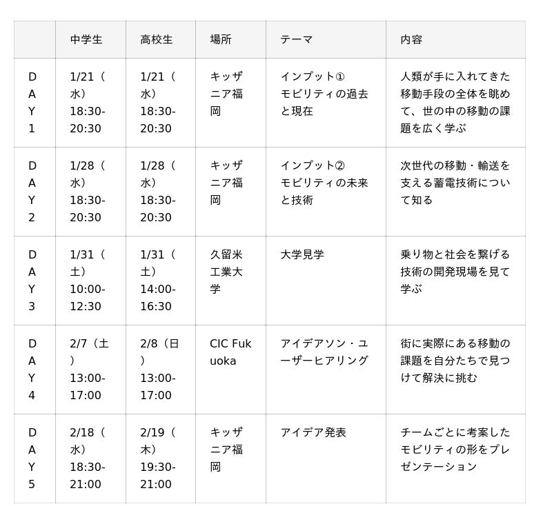 本ワークショップは、中・高生を対象に、蓄電池・モビリティ分野を中心としたテクノロジー分野への興味関心を深め、将来について考えるきっかけづくりのサポートを目的に開催します。メイン講師としてトヨタ自動車の植野 直亮氏、久留米工業大学の東 大輔氏を迎え、中学生および高校生に分けたコースを提供することで、それぞれの年代に合わせたモビリティに関するレクチャーやフィールドワークを、それぞれ5日間の日程で行います。電気自動車に欠かせない蓄電池の仕組みや技術のほか、次世代に必要とされる新しいモビリティにも目を向けられる内容を通じて、こども達が未来について考える機会を提供してまいります。