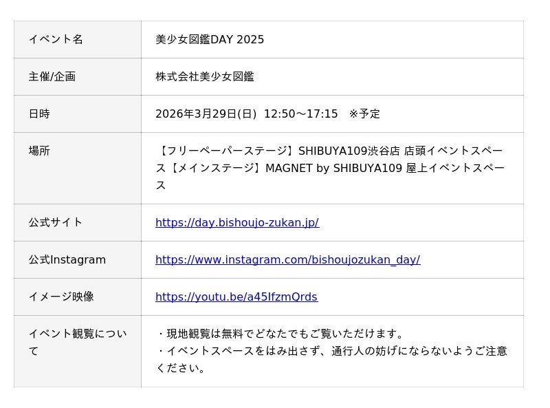 株式会社美少女図鑑(東京都渋谷区、代表取締役:中村孔亮)が運営する地域密着型メディア『美少女図鑑』は、全国各地の美少女図鑑モデルが集結する1DAYイベント「美少女図鑑DAY 2025」を2026年3月29日(日)にSHIBUYA109渋谷店 店頭イベントスペースならびにMAGNET by SHIBUYA109 屋上イベントスペースにて開催します。なお、本イベントは天候により中止となった2025年10月26日(日)開催予定分の振替実施となります。
