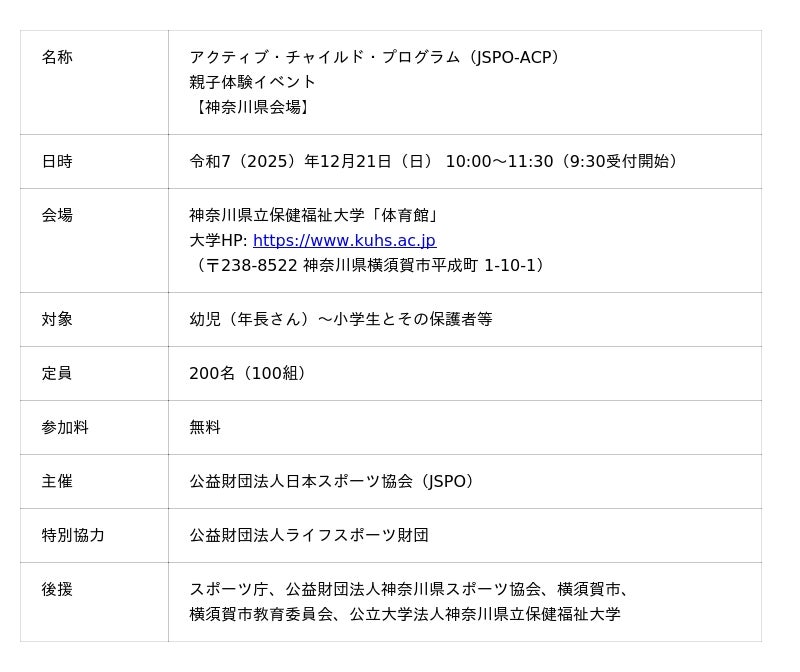 このたび、JSPO-ACPの普及・啓発の一環として、『JSPO-ACP実践モデル事業』に関する連携協定締結先である横須賀市教育委員会と連携し、親子等で楽しみながら身体を動かすことができる体験イベントを下記のとおり開催いたします。