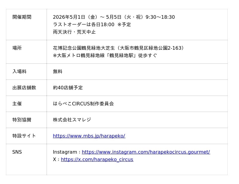 iPadなどのタブレットを利用したクラウドPOSレジ『スマレジ』を展開する株式会社スマレジ(本社:大阪市中央区、代表取締役:宮崎 龍平、以下「当社」)は、株式会社毎日放送(本社:大阪市北区茶屋町17番1号)が開催する『スマレジ presents はらぺこCIRCUS 』(2026年5月1日(金)~5月5日(火・祝)の全5日間、鶴見緑地 大芝生(大阪市鶴見区))に特別協賛いたします。