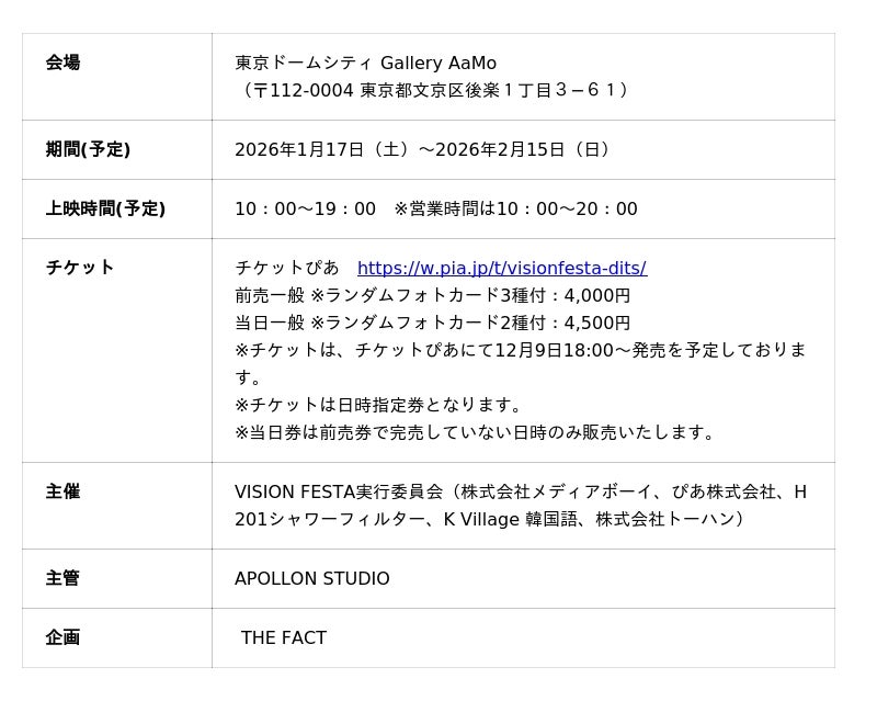 本エキシビションは、2021年~2023年に「THE FACT MUSIC AWARDS(TMA)」に出演したアーティストたちの音楽やパフォーマンスの世界観を、VR SHOW体験・展示・グッズ販売など多彩なコンテンツを通じて楽しめる体験型イベントです。コンサートとはまた違う角度からK-POPの魅力に触れられる貴重な機会として、多くのファンから注目を集めています。