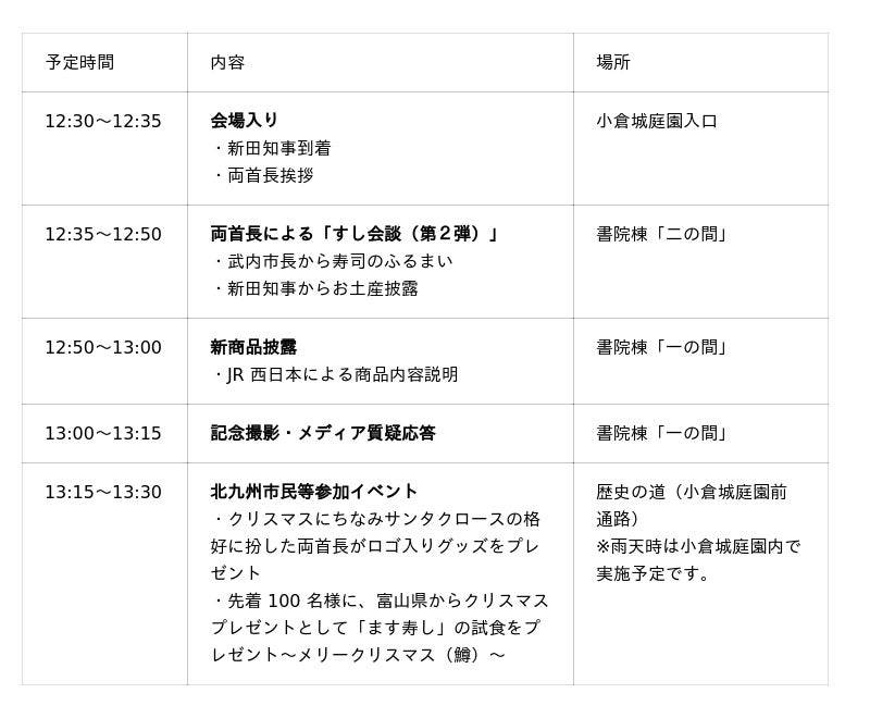 さらに、当日は、サンタクロースの格好に扮した両首長からイベント会場来場者へのクリスマスプレゼントを企画しています。また、メリークリスマス(鱒)にちなんで、富山県のご当地寿司「ます寿し」の試食のプレゼントも行います。