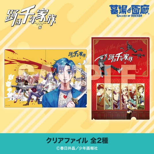 不老不死の7兄弟を描くアクションコメディ漫画『踊る千年家族』の美麗イラストをプリントしたクリアファイル2種が登場!第1話で描かれたインパクト絶大なイラストと、第18話で巻頭カラーを飾った見開きイラストの2種!命より大切な書類を守るために、この不死のクリアファイルは必携!