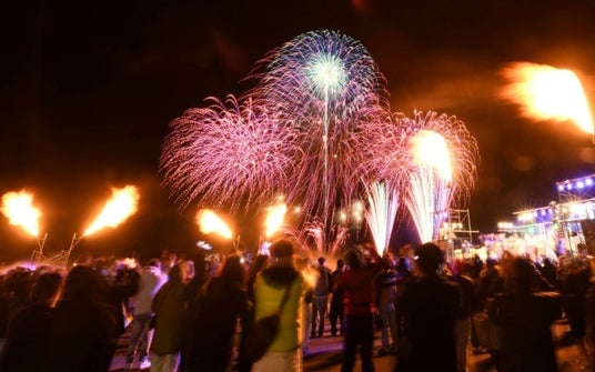 地元出身ミュージシャンのライブと、炎・照明・花火が融合した光のショーで盛り上がり、年明け前には会場全員で一斉に新年へ向けたカウントダウンに突入します。