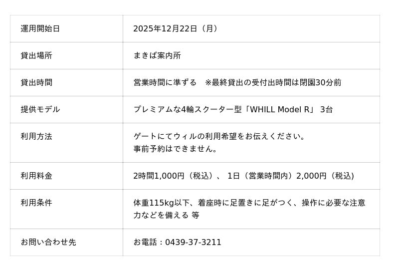 株式会社マザー牧場(本社:千葉県富津市、代表取締役社長:前田伸、以下「マザー牧場」)とWHILL株式会社(本社:東京都品川区、代表取締役社長 CEO:杉江理、以下「WHILL社」)は、場内において免許不要で歩行領域を走行する近距離モビリティWHILL(ウィル)を活用した移動サービス「WHILLモビリティサービス」が導入されることを発表いたします。動物や地球環境にも配慮しながら、老若男女問わずあらゆる人が高低差のある広い敷地内を快適に周遊できるアクセシビリティ環境をさらに整える狙いです。本サービスは、クリスマスシーズンや年末年始、冬休みなどご家族・親戚と過ごす機会も増えるなか、2025年12月22日(月)より運用開始いたします。