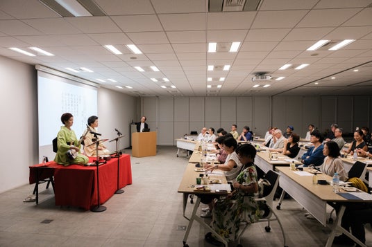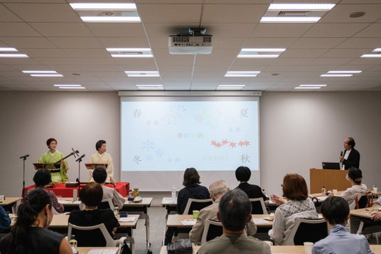 情報館では日本酒を歴史・文化とともに楽しんでいただくご提案をしています。その一環として、本年は江戸・明治の時代から宴席で粋人に愉しまれてきた「小唄」をテーマに季節のうつろいとともに日本酒を楽しんでいただくイベントを行いました。今回のテーマは「小唄で巡る日本酒の四季」。小唄には四季折々の風情や人生の機微が巧みに織り込まれています。米作りにはじまる日本酒の四季と、それぞれの季節に寄り添う日本人の暮らしを、邦楽ユニット〈明暮れ小唄〉による20曲の小唄生演奏と、情報館館長の今田周三による解説とともにたどりました。会場となった日本酒造組合中央会3階会議室は定員30名が満席となり、日本酒と小唄が織りなす雅な時間が流れました。