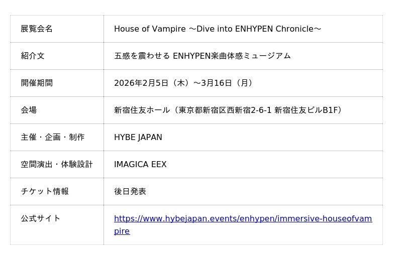 HYBE JAPANは、日本オリジナルの企画として、HYBE MUSIC GROUPアーティストとして初となる没入型楽曲体感ミュージアム『House of Vampire ~Dive into ENHYPEN Chronicle~』を、2026年2月5日(木)から3月16日(月)まで東京・新宿住友ホールにて開催します。