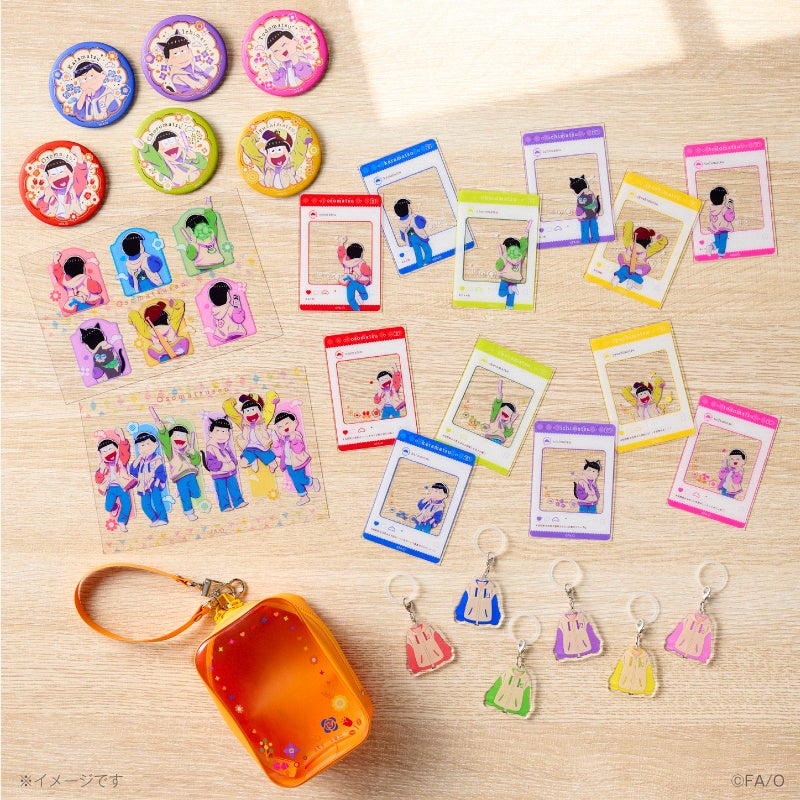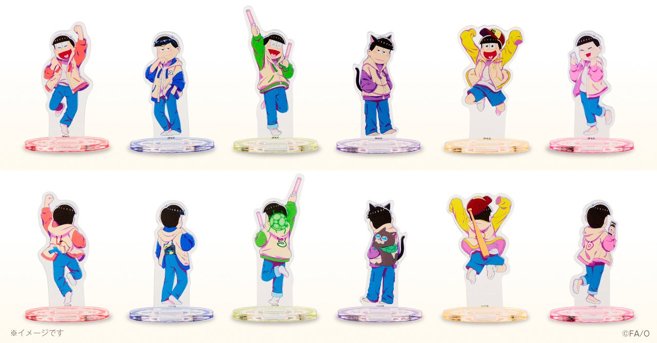 食事を喜んでいる6つ子をうしろ姿まで描き下ろした両面アクリルスタンドとこてっちゃんをセットにしたコラボ商品です。同時にオリジナルグッズのオンラインガチャも開催いたします。