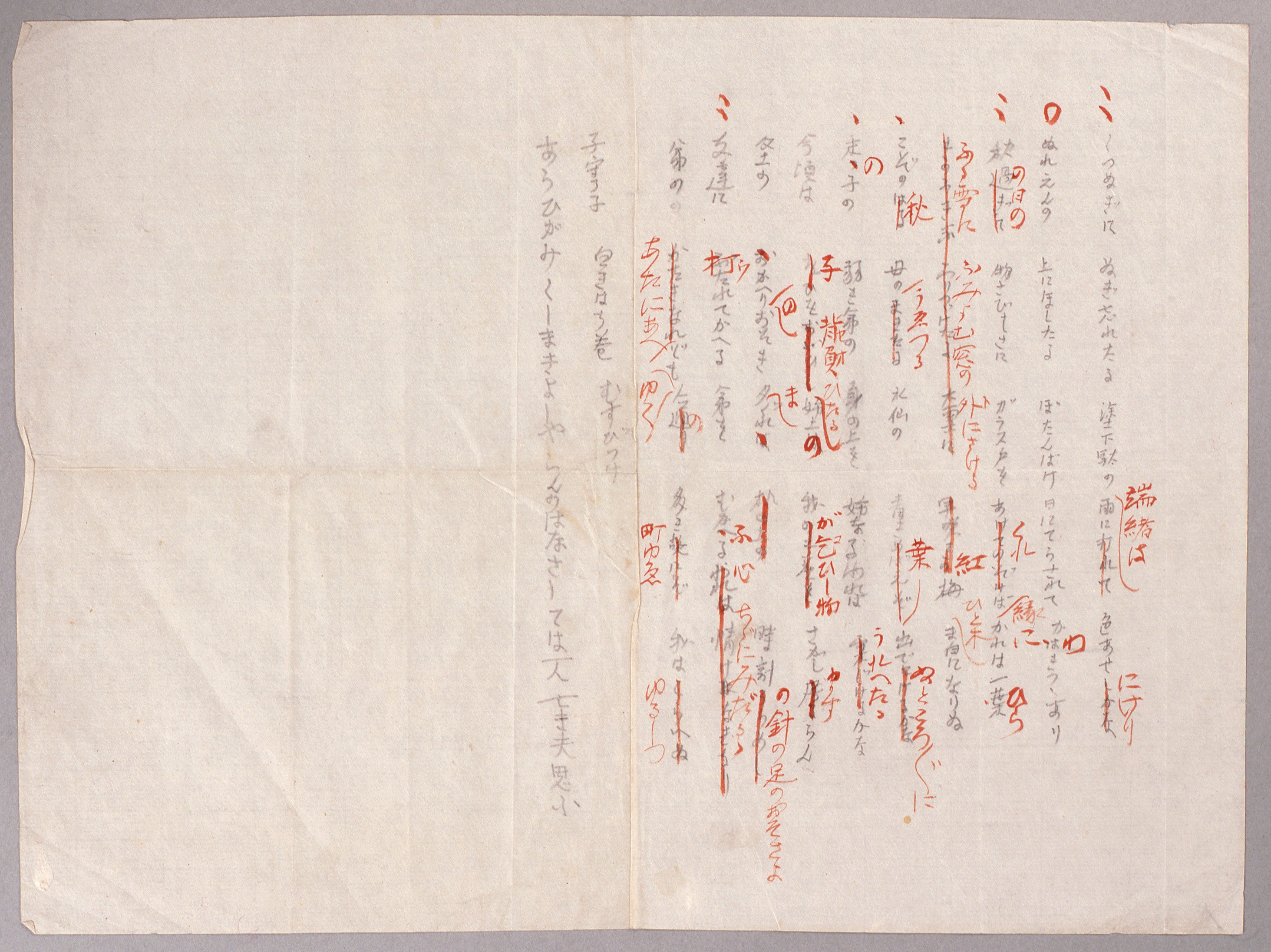 杏奴短歌草稿、鴎外添削 大正期杏奴が詠んだ短歌に鴎外が朱筆で添削している。