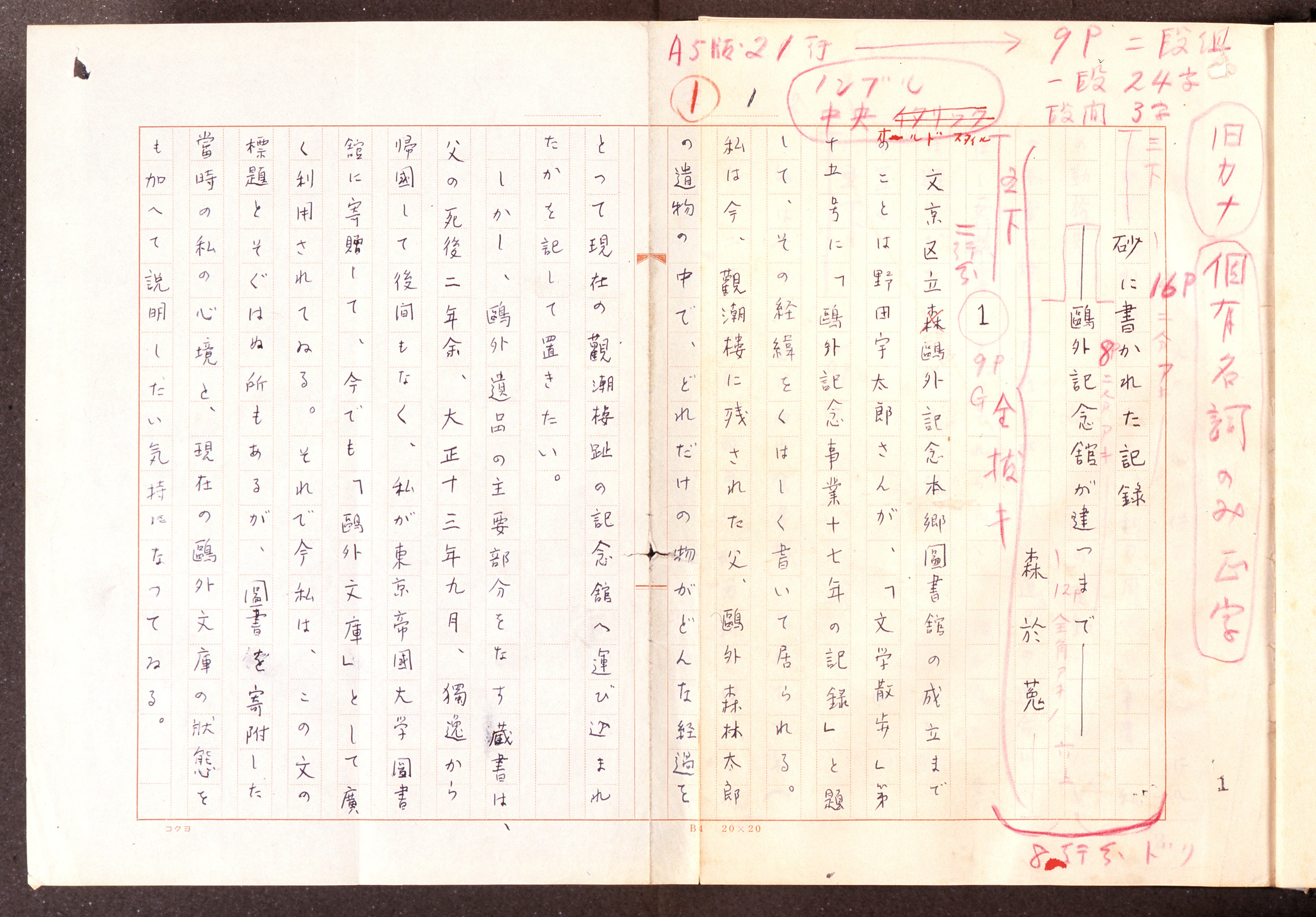 於菟自筆原稿『砂に書かれた記録』 1965年発表鴎外没後、遺品を守り、最終的に文京区へ寄贈するまでの経緯を記した随筆。