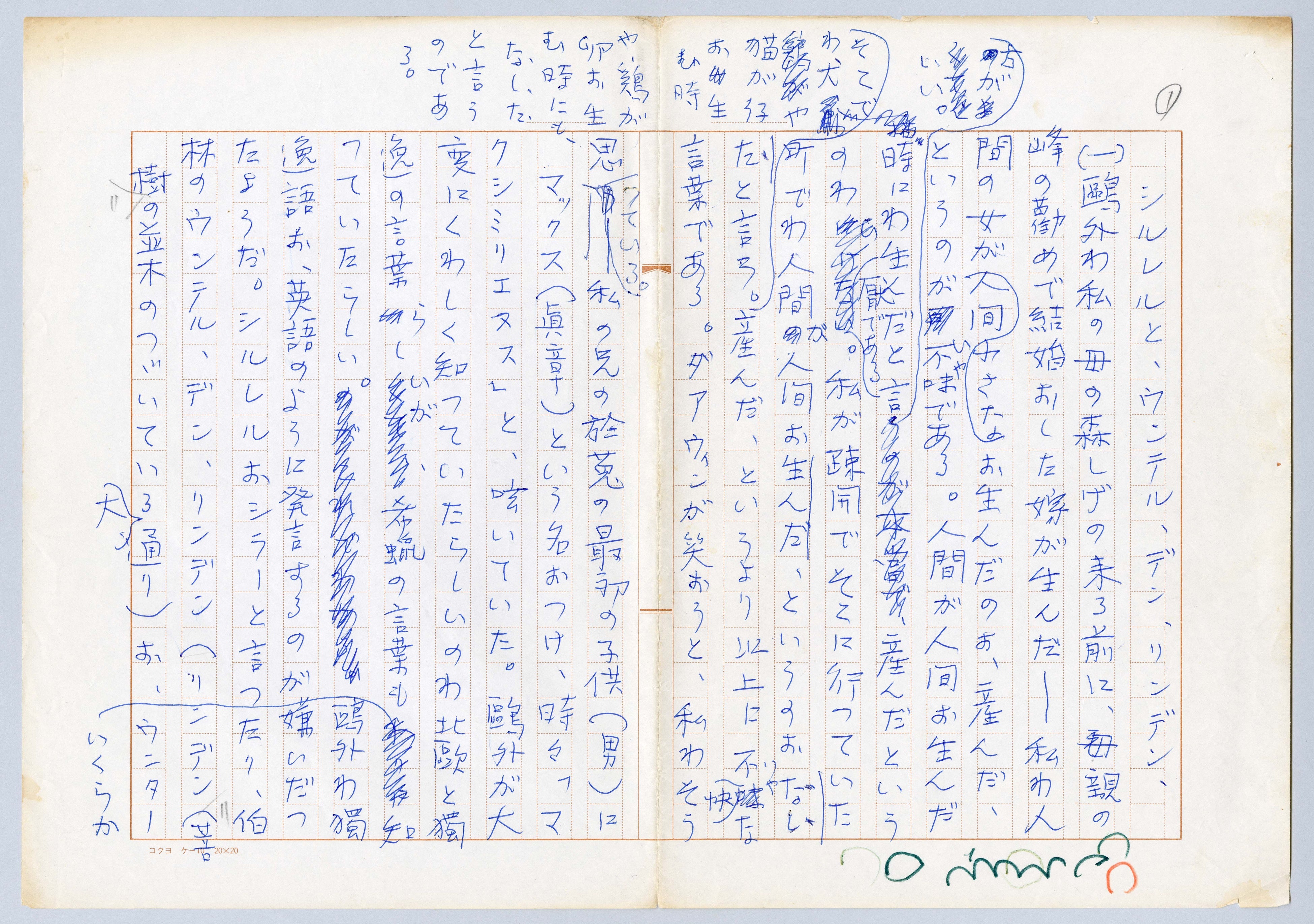 類自筆原稿『散歩』 1967年発表大人になった類が鴎外と再会し散歩をする夢を描く。鴎外との記憶が少年時代で止まっている類が、夢のはなしとして鴎外への思慕を綴る。