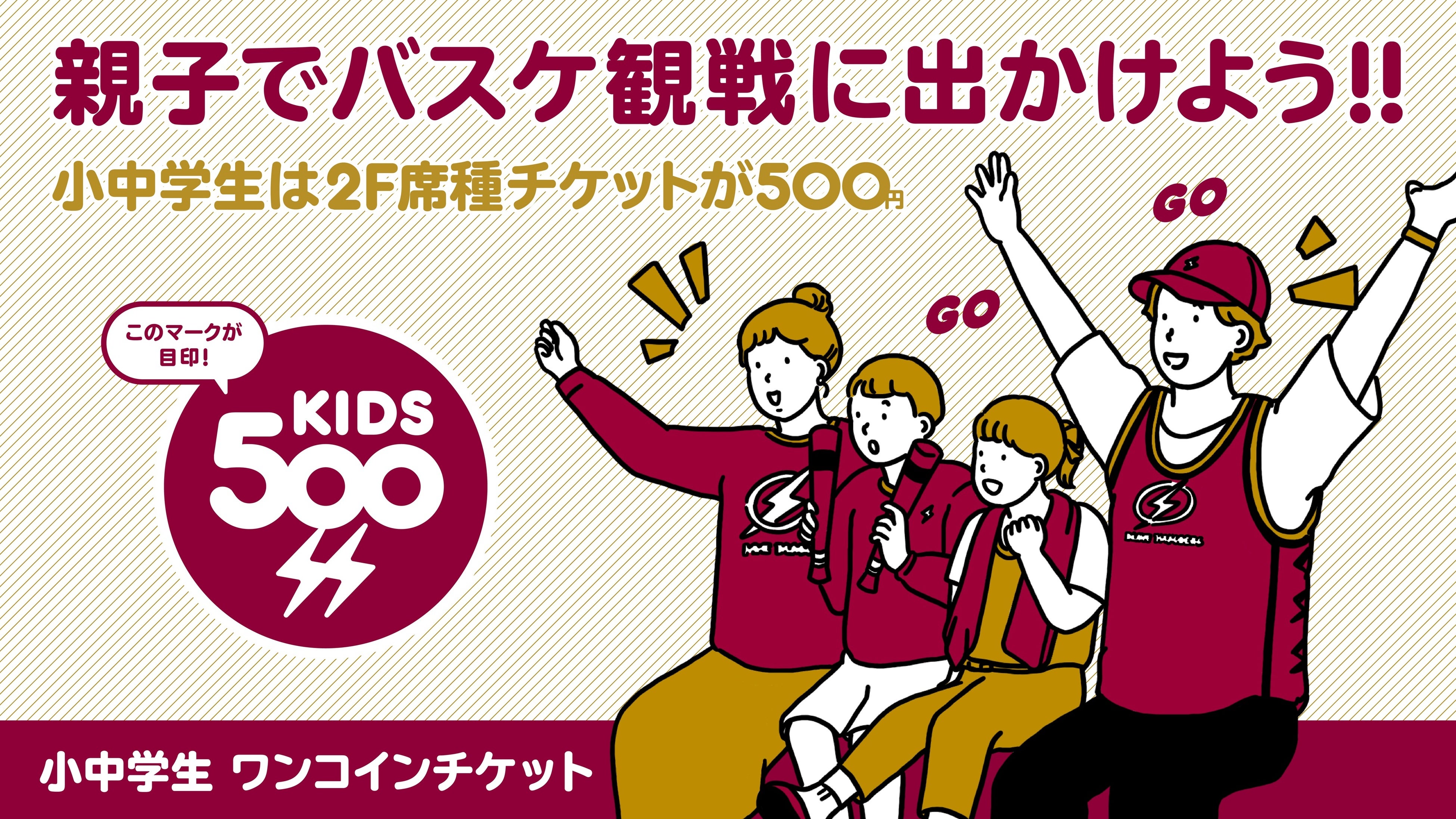 企画チケット「小中学生ワンコインチケット」親子でのバスケ観戦をより多くの方にお楽しみいただくための企画チケット「小中学生ワンコインチケット」を販売します。 2F席種の「小中学生」券種を500円でお買い求めいただけます(別途、1枚以上の一般席種チケットを購入が必要となります)。