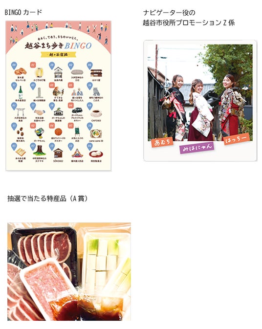 3.BINGOカードに描かれた各スポットを見つけ、タテ・ヨコ・ナナメのどれか一列がそろったらビンゴクリア。アンケートに答えると、越谷市の特産品が当たる抽選に応募可能