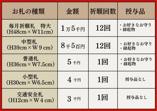 1万5千円のお札は毎月祈願の際、個別にお名前も読み上げます。