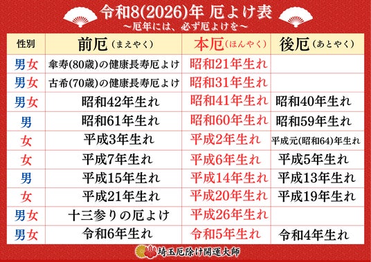 令和8年(2026)の厄年早見表【年齢(生まれ年)別】